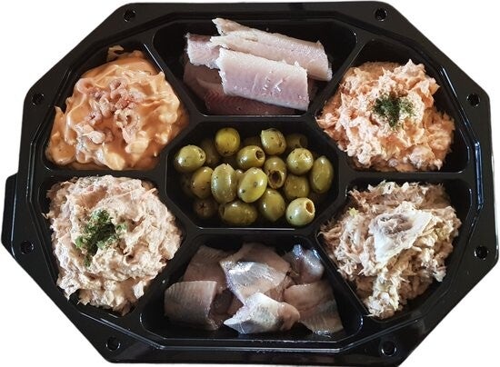 Cateringschaal met 7 vakken die veel wordt gebruikt voor gourmet vlees, fondue vlees, borrelhapjes en tapas. Met transparante deksels.
